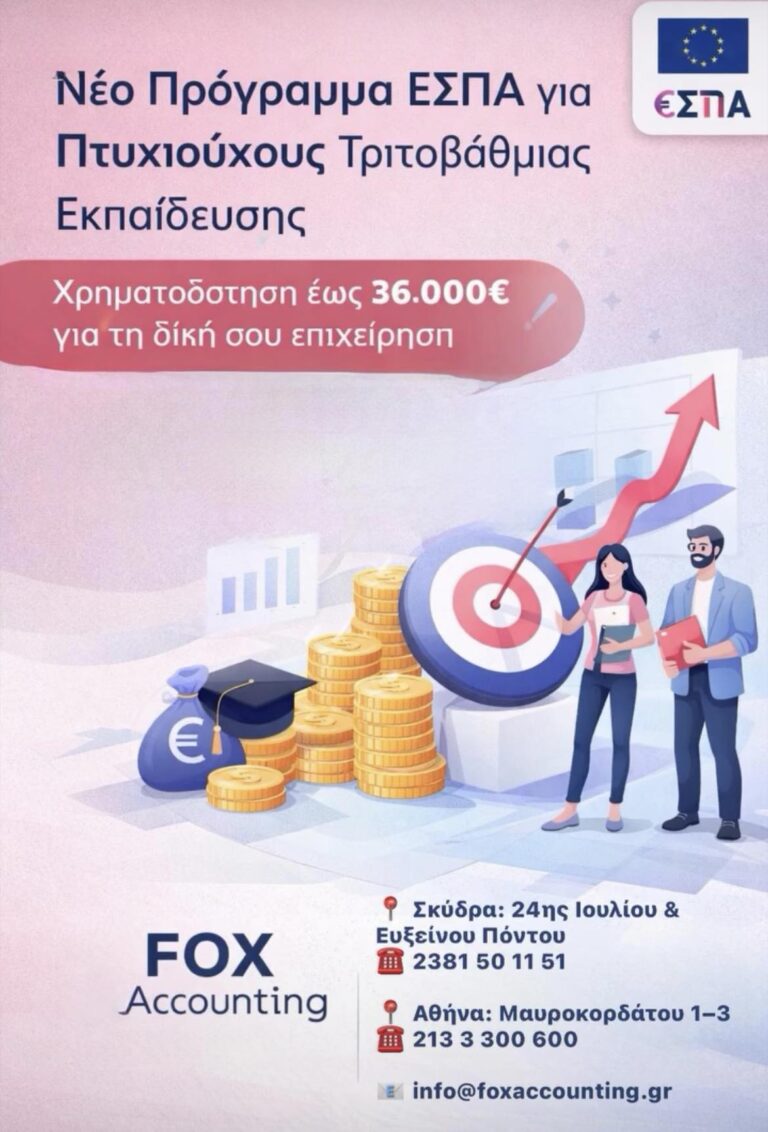 Χρηματοδότηση έως 36.000€ για τη δική σου επιχείρηση Ανακοινώθηκε νέο πρόγραμμα ΕΣΠΑ που αφορά πτυχιούχους τριτοβάθμιας εκπαίδευσης και στηρίζει έμπρακτα το πρώτο – ή επόμενο – επαγγελματικό τους βήμα. Αναμένεται…