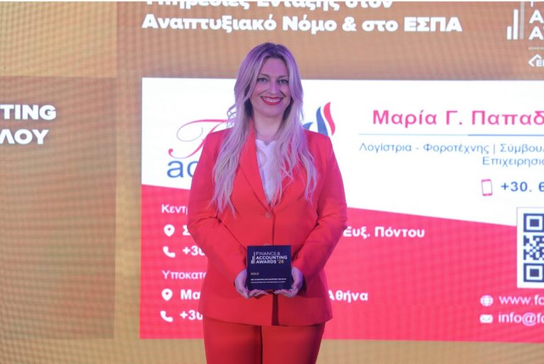 Με ιδιαίτερη χαρά ανακοινώνω ότι η FOX Accounting τιμήθηκε με το Gold Award στα Finance & Accounting Awards 2026 για τις Υπηρεσίες Ένταξης στον Αναπτυξιακό Νόμο & στο ΕΣΠΑ. Η…